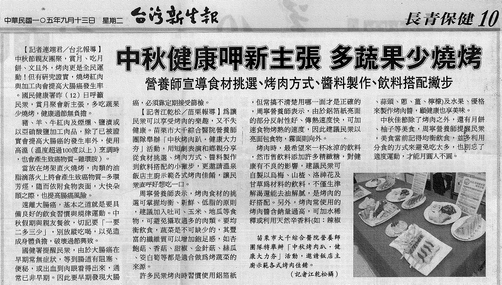 105.09.13台灣新生報:中秋健康呷新主張多蔬果少燒烤