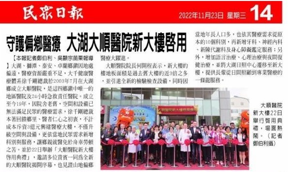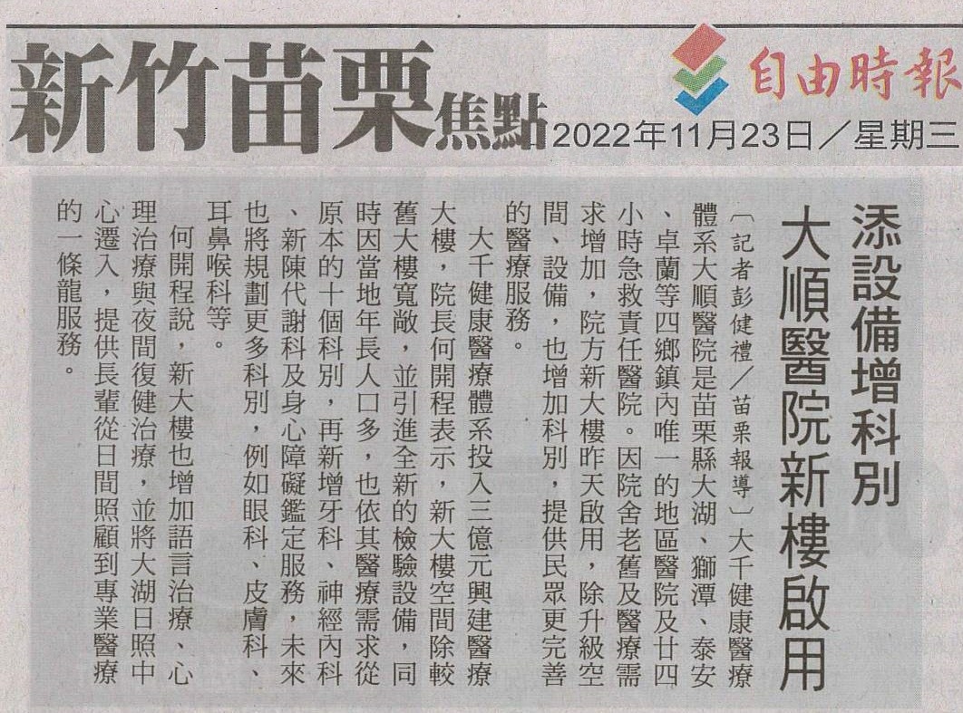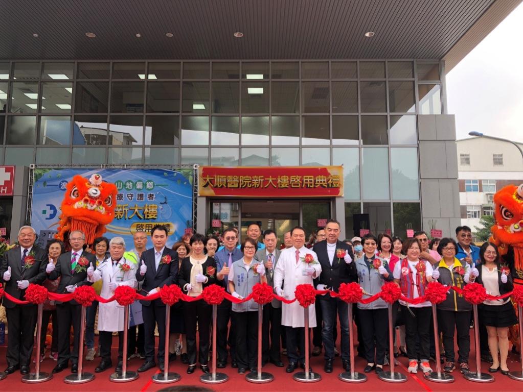 大湖鄉、獅潭鄉、泰安鄉、卓蘭鎮因地處偏遠,醫療資源嚴重不足,大千健康醫療體系徐千剛總裁於2003年7月於大湖鄉成立大順醫院,是這四鄉鎮中唯一的地區醫院及24小時急救責任醫院。成立至今已19年,因院舍老舊,空間和設備已無法滿足民眾的醫療需求,徐千剛總裁本著回饋鄉里、醫者仁心之初衷,不計成本斥資三億興建醫療大樓。不僅升級空間與設備,更依當地民眾需求新增科別與服務,讓鄉親就醫免於舟車勞頓之苦。今日(11/22)特舉辦「大順醫院新大樓啟用典禮」,邀請多位貴賓一同為全新的大順醫院揭開序幕,也見證山地偏鄉醫療大躍進。
