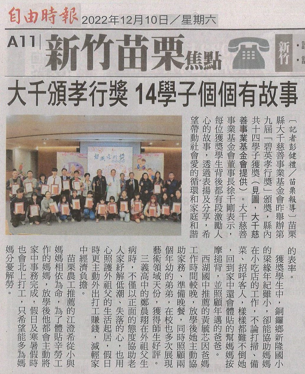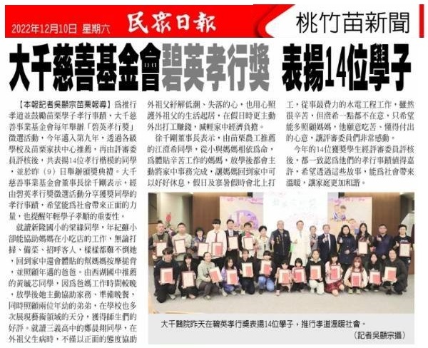 為推行孝道並鼓勵苗栗學子孝行事蹟,大千慈善事業基金會每年舉辦「碧英孝行獎」徵選活動,今年邁入第九年,透過各級學校及苗栗家扶中心推薦,再由評審委員評核後,共表揚14位孝行楷模的同學,並於今天(12/9)舉辦頒獎典禮。大千慈善事業基金會董事長徐千剛表示,經由碧英孝行獎徵選活動分享獲獎同學的孝行事蹟,希望能為社會帶來正面的力量,也提醒年輕學子孝順的重要性。