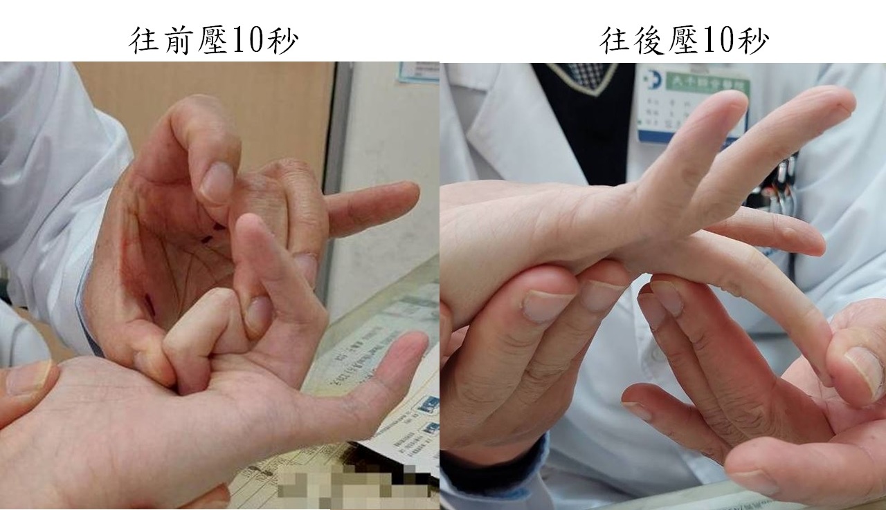 由於有些病人是疼痛忍了很久才就醫,不僅手指卡住,肌腱都已攣縮,因此容志雄醫師建議,在手術傷口復原後,在家可進行簡單的復健動作,先泡熱水把肌腱放鬆,再慢慢把手指往前壓10秒、往後撐10秒,重複做100-200次,連續做三週就能幫助手指恢復原來的狀態。
