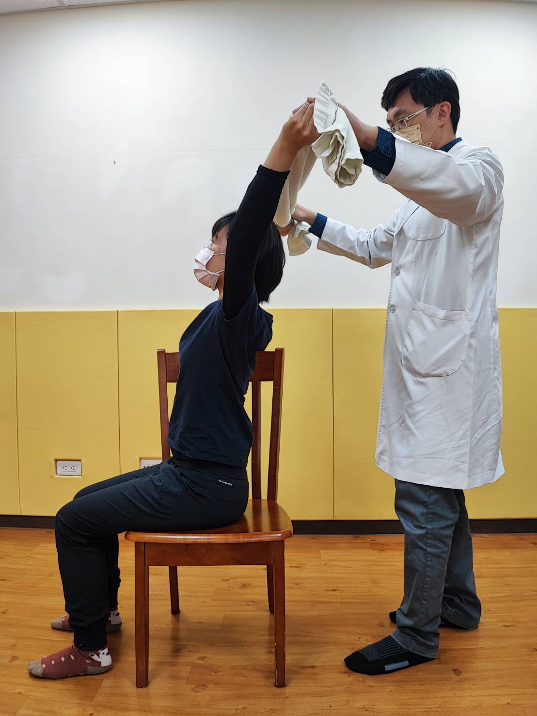 ●增加胸椎活動度-第一式準備工具:毛巾一條,對折呈長條型。起始位置:坐在椅子上,雙腳與肩同寬。雙手位置:左右手拉著毛巾兩端,向後伸展。