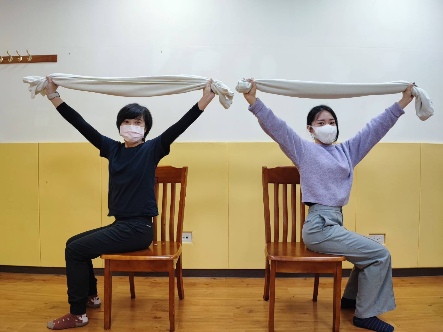 ●增加胸椎活動度-第二式準備工具:毛巾一條,對折呈長條型。起始位置:坐在椅子上,雙腳與肩同寬。雙手位置:左右手拉著毛巾兩端,向左右旋轉。