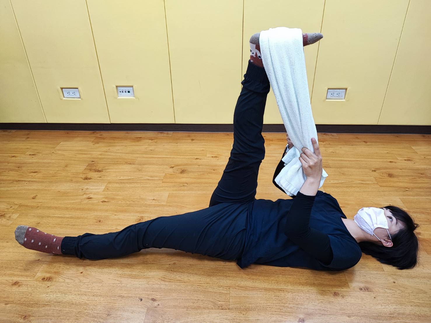 ●放鬆腿部後側肌肉準備工具:毛巾一條,對折呈長條型。起始位置:平躺在地上。雙手位置:左右手拉著毛巾兩端,毛巾勾在右腳腳掌上,調整腳伸直的角度。