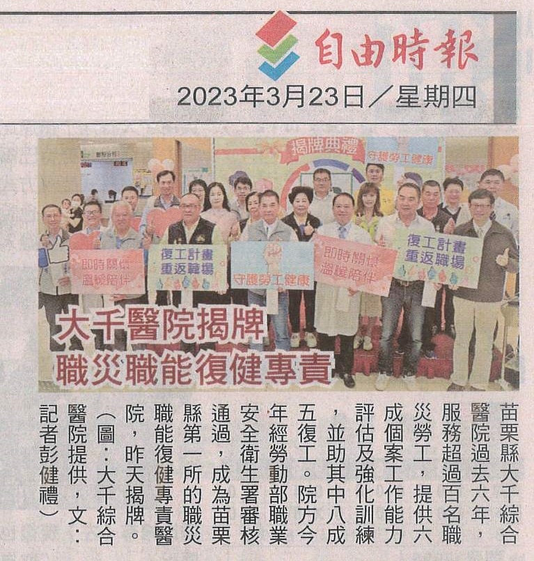 為協助職業災害勞工能順利返回職場,大千綜合醫院於2017年成立工作強化中心,截至2022年已服務超過百位職災個案,其中有六成的個案接受工作能力評估及強化訓練,且復工率達85%。2023年經勞動部職業安全衛生署審核通過,成為苗栗縣唯一之職災職能復健專責醫院,並於今日(3/22)邀請鍾東錦縣長等多位貴賓,共同進行揭牌儀式。