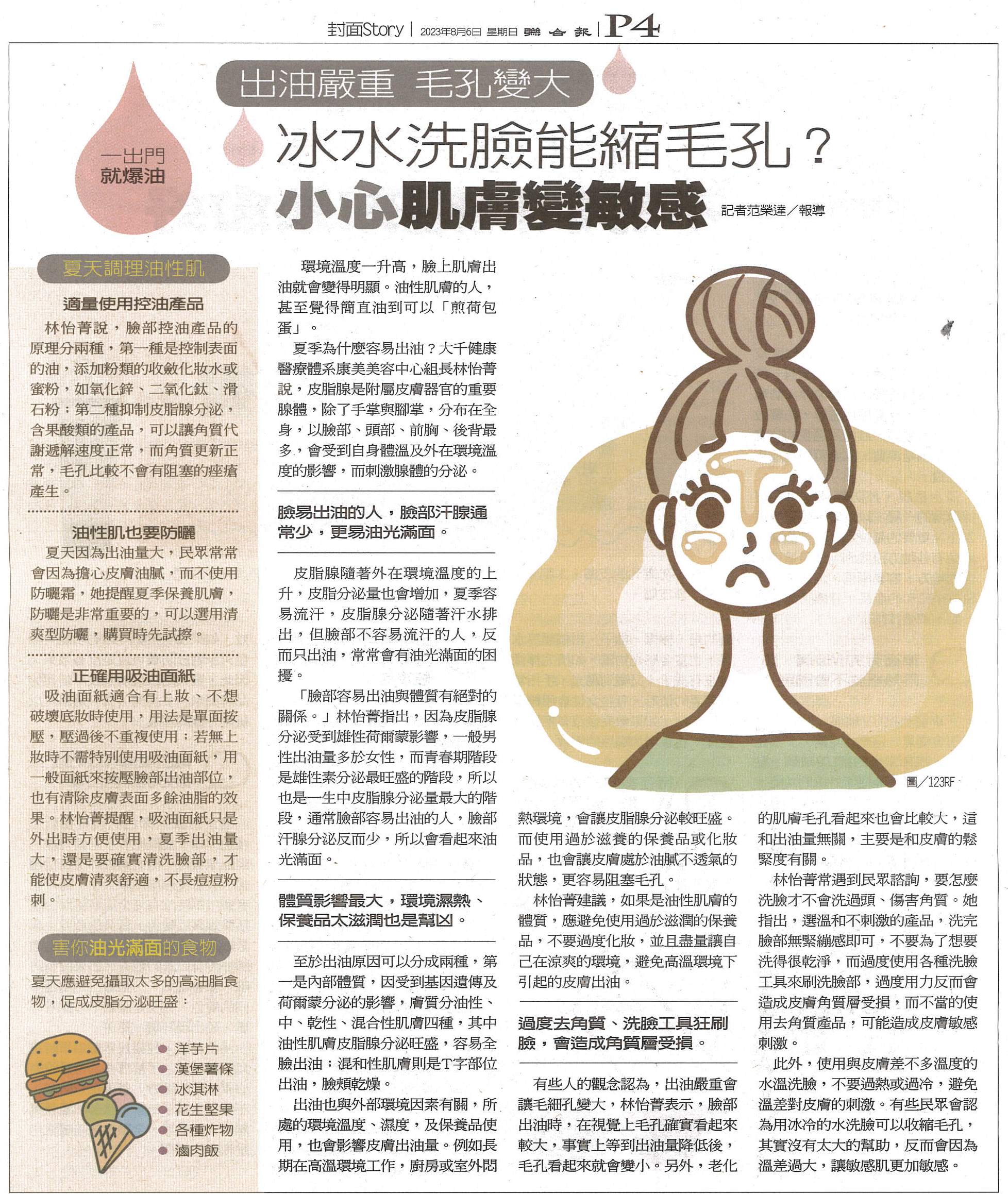 林怡菁建議,如果是油性肌膚的體質,應避免使用過於滋潤的保養品,不要過度化妝,並且盡量讓自己在涼爽的環境,避免高溫環境下引起的皮膚出油。