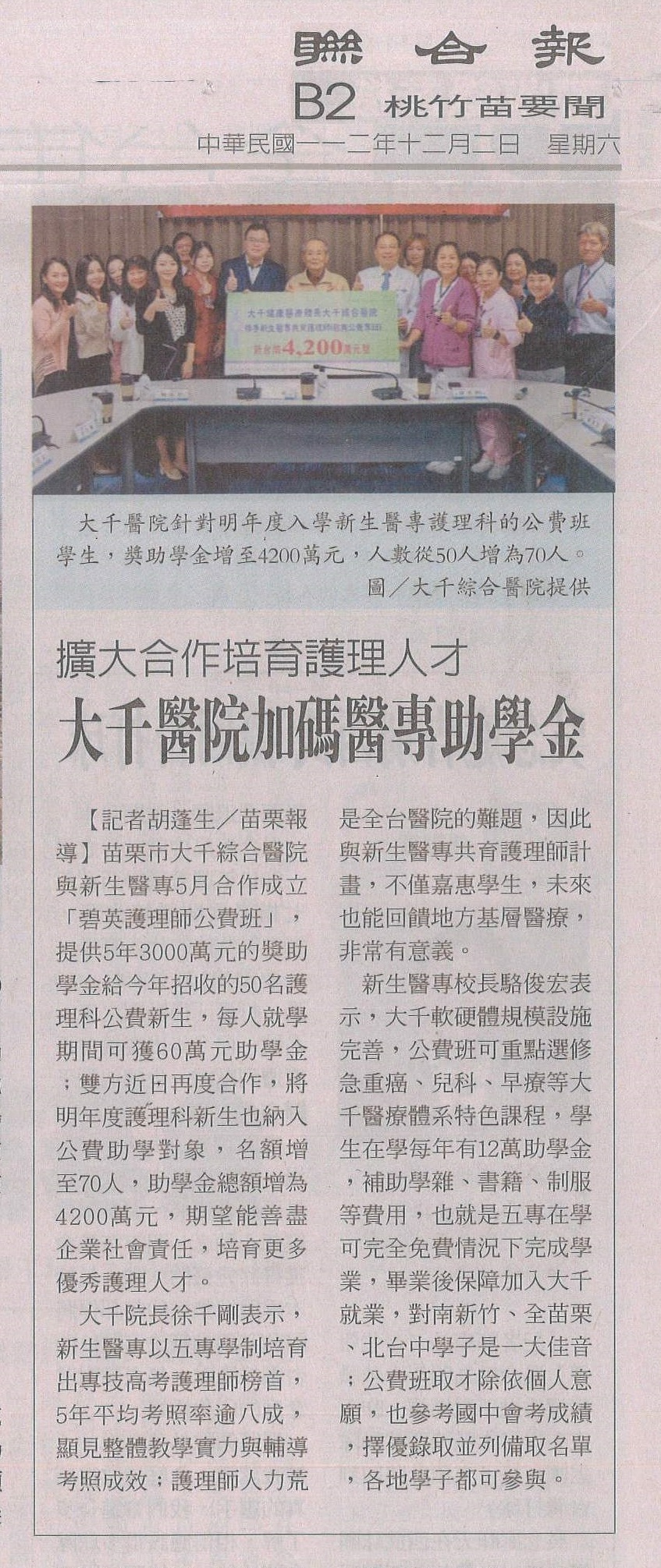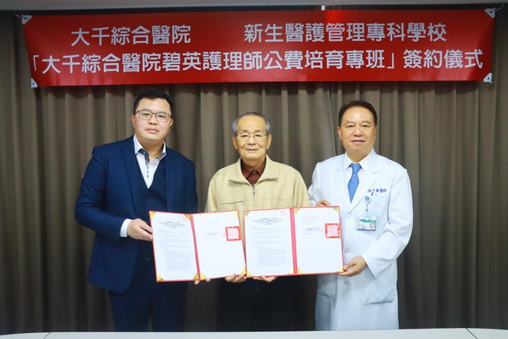 為積極培育護理專才,大千綜合醫院與新生醫護管理專科學校繼今年五月簽署合作意願書,成立112年度「碧英護理師公費班」後,再次攜手合作。大千將對明年(113學年度)入學新生醫專護理科的學生,由原本的5年3000萬元獎助學金,提高至4200萬元,期望能善盡企業社會責任,培育更多優秀護理人才。會中,新生醫專也頒發聘書,聘請大千護理部解旻容主任為該校護理科兼任助理教授級專業技術教師,讓雙方產學合作更加密切!
