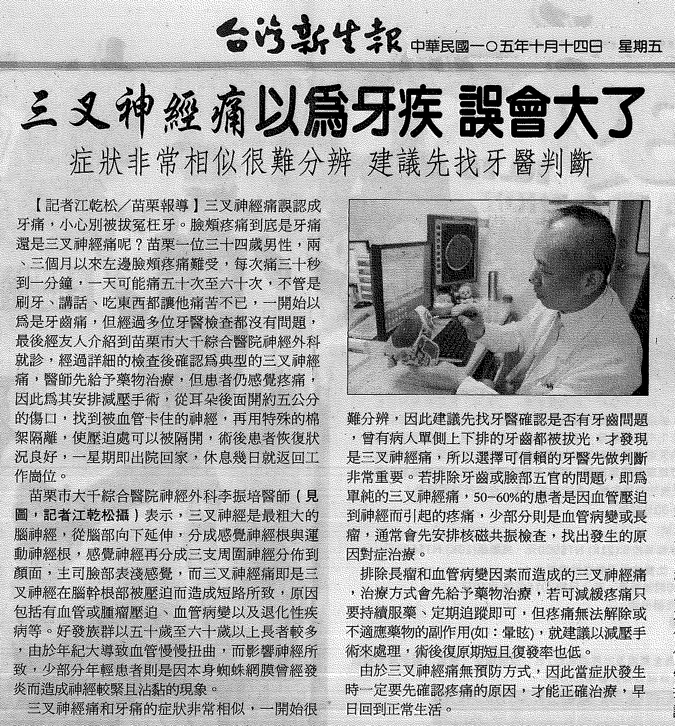 105.10.14台灣新生報:三叉神經痛以為牙疾誤會大了
