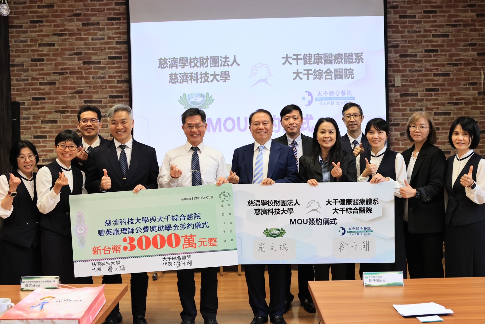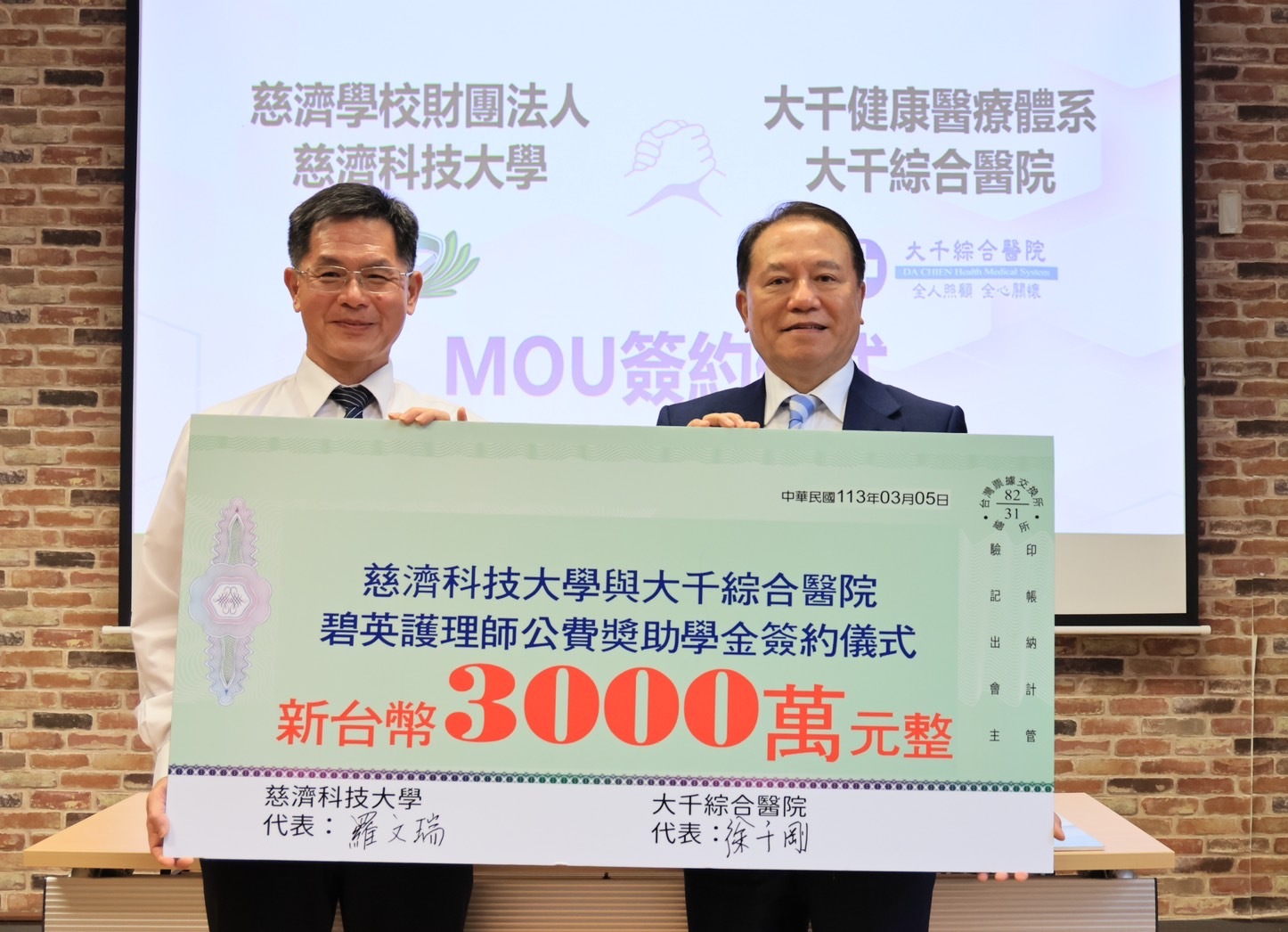 慈濟科技大學校長羅文瑞表示,涵蓋各學制的護理系,不但有五專、四技、二技、研究所,還有今年首度招生的學士後護理系,教學資源非常豐富,能與大千簽署護理師公費獎助方案,既能嘉惠學生、降低經濟壓力,又能回饋苗栗醫療,是非常有意義的事情。同時,慈濟科技大學111學年度護理師考照率達77.12%,高於全國平均值45.73%,足顯校方的用心與辦學成果。