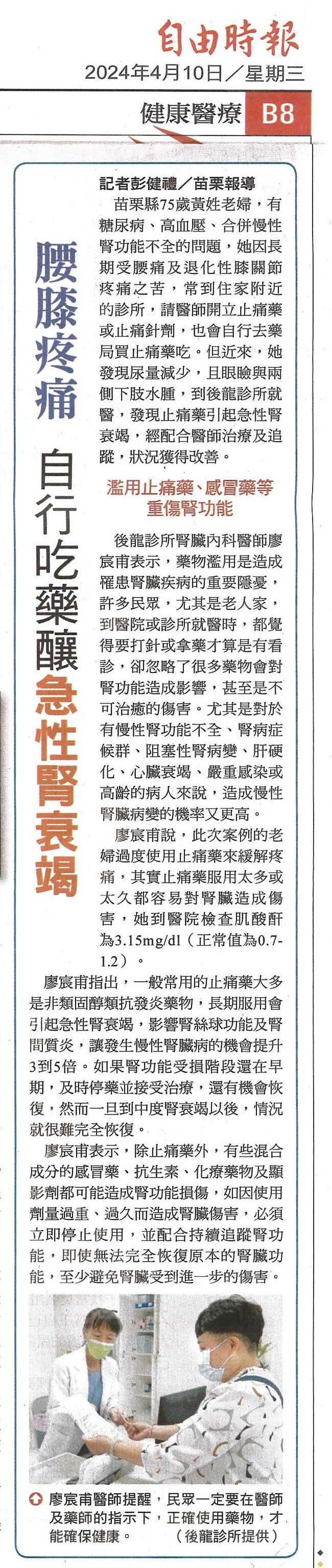 後龍診所腎臟內科醫師廖宸甫表示,藥物濫用是一般民眾,尤其是老人家,罹患腎臟疾病的重要隱憂,因為很多民眾到醫院或診所就醫時,都覺得要打針或拿藥才算是有看診,卻忽略了很多藥物會對腎功能造成影響,甚至是不可治癒的傷害。此次案例的黃奶奶過度使用止痛藥來緩解疼痛,其實止痛藥服用太多或太久都容易對腎臟造成傷害,尤其是對於有慢性腎功能不全、腎病症候群、阻塞性腎病變、肝硬化、心臟衰竭、嚴重感染或高齡的病人來說,造成慢性腎臟病變的機率又更高。