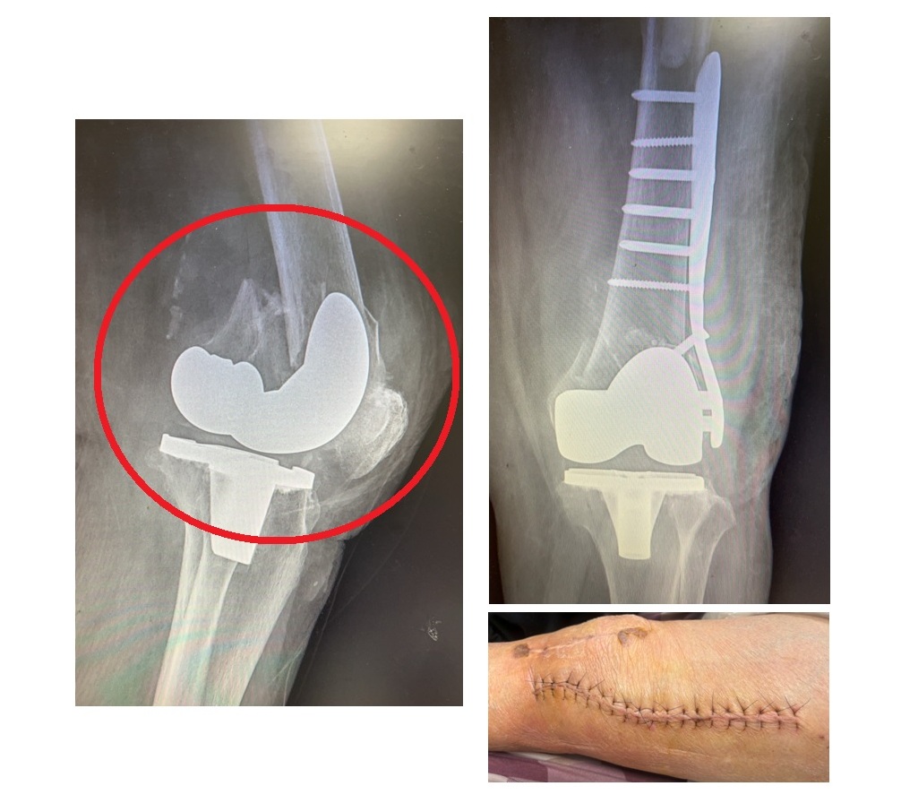 93歲的奶奶使用傳統人工墊片,跌倒後骨頭破裂(左圖紅圈處),須以傳統開刀方式治療(右方上下圖)。