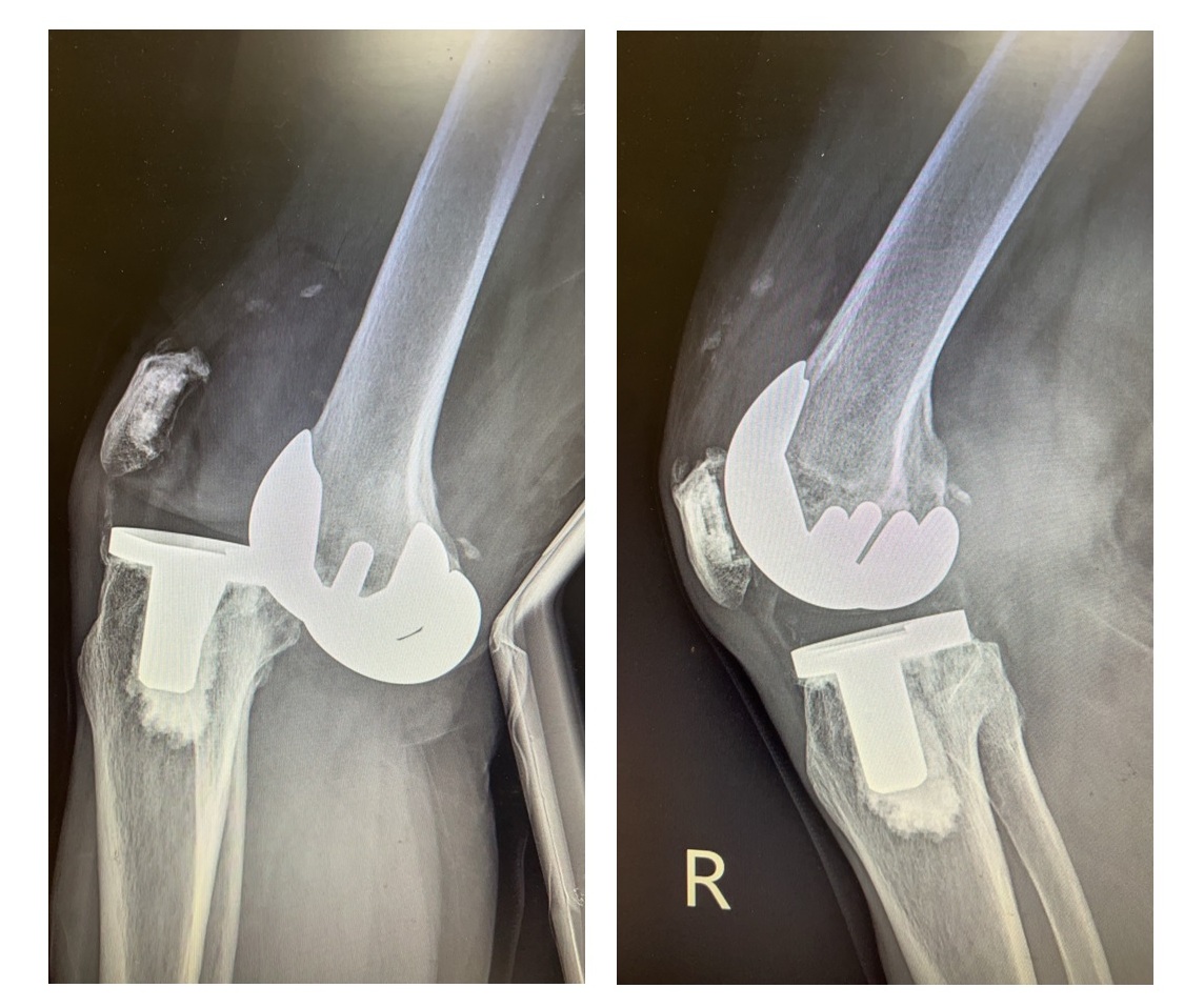 71歲女士使用高貼合度人工墊片,跌倒後僅關節脫臼,骨頭無問題(如左圖),將關節拉回後並無大礙(如右圖)。
