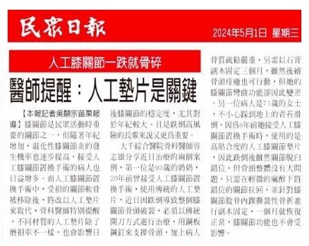 容志雄醫師表示,人工膝關節置換手術可幫助病人恢復日常生活功能,甚至運動都不受影響,其中人工墊片的選擇扮演重要的角色,因此,建議在接受人工膝關節置換手術之前,可以多了解各種人工墊片的差異,選擇適合的墊片才能確保日後的生活品質。