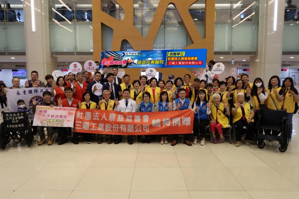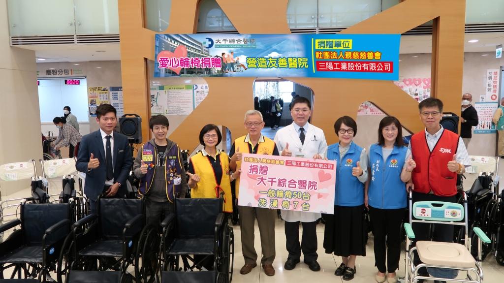 為幫助就醫行動不便的病人,社團法人親慈慈善會、三陽工業股份有限公司及永青國際同濟會集結愛心,共同捐贈50台輪椅與7張便盆洗澡椅給大千綜合醫院,並於今日(5/14)在苗栗縣副縣長鄧桂菊和衛生局副局長莊素玲的見證下,舉辦捐贈儀式,期望這批輪椅能嘉惠更多有需要的民眾,讓愛輪轉、傳承善意不止息。