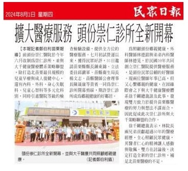 前頭份崇仁醫院於今年六月改制為崇仁診所,並與大千健康醫療體系策略聯盟,除打造北苗栗最具規模的兒童早療與成人復健中心,還包含內科、外科、身心失眠科、兒童心智科等多元化科別,同時引進醫院等級的檢查檢驗設備,提供全方位的醫療服務。自七月初試營運以來,獲得民眾一致好評,並於今日(7/31)邀請立法委員邱鎮軍、立法委員陳超明、苗栗縣縣長鍾東錦、頭份市市長羅雪珠等貴賓,一同為崇仁診所進行開幕剪綵,並且期許崇仁診所能成為鄉親健康的好鄰居。