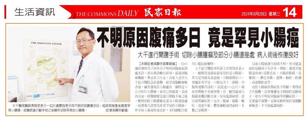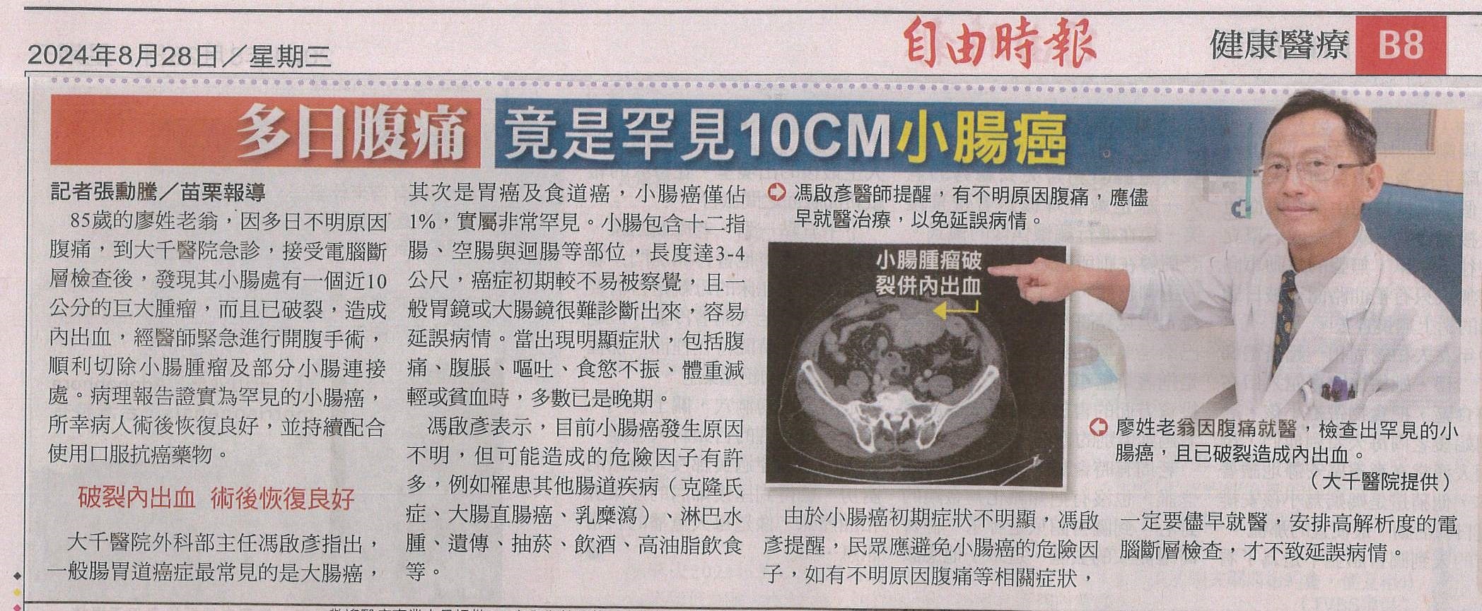 85歲的廖先生因多日不明原因腹痛而到處求診,卻未被診斷出原因,最後因腹痛難耐,無法直立行走,由家人送至大千綜合醫院急診就醫。接受電腦斷層檢查後,赫然發現其小腸處有一個將近10公分的巨大腫瘤,而且已經破裂,造成內出血,經醫師緊急進行開腹手術之後,順利切除小腸腫瘤及部分小腸連接處。病理報告證實為非常罕見的小腸癌,所幸病人術後恢復良好,並持續配合使用口服抗癌藥物。