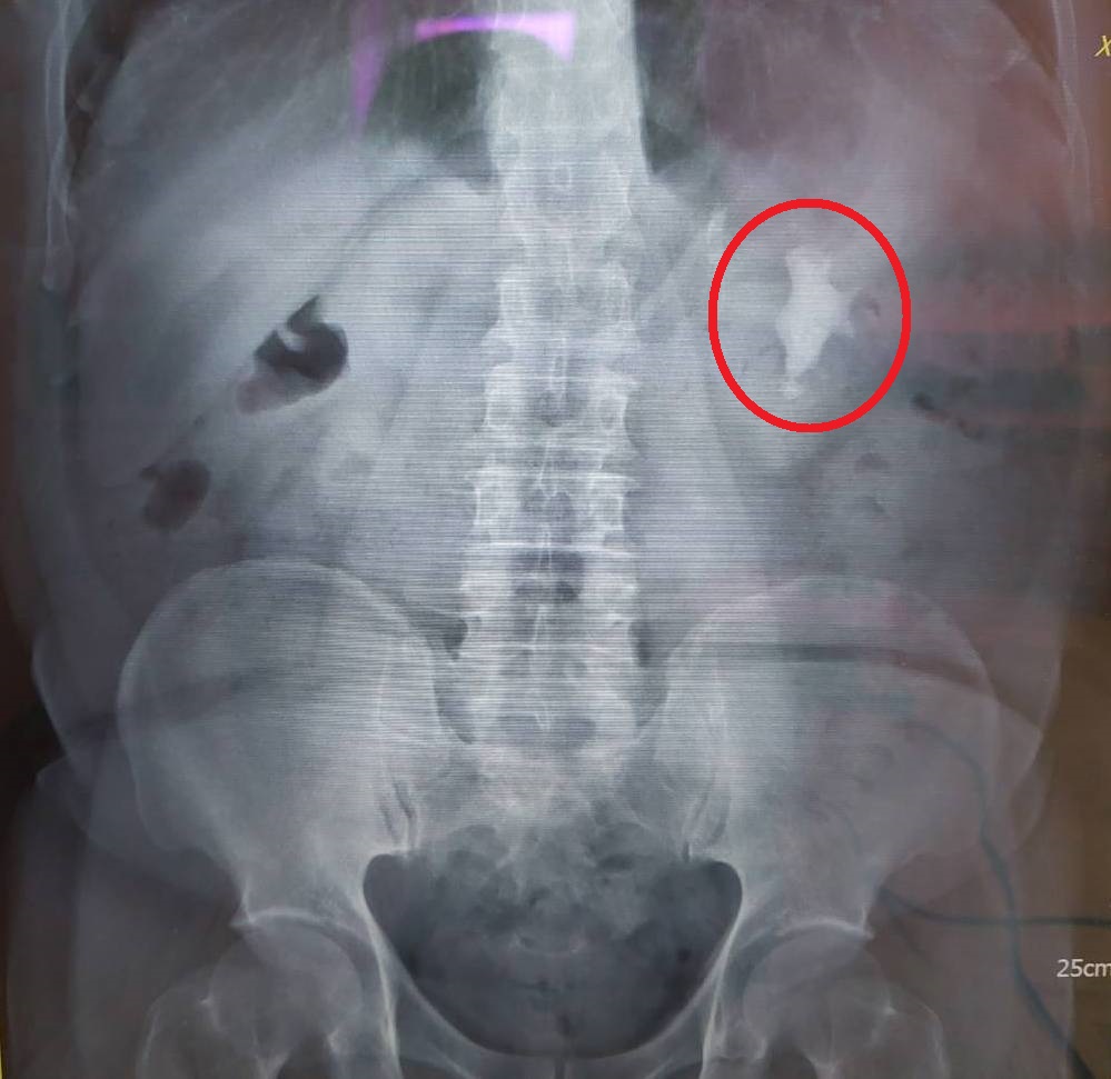 經X光檢查發現,病人的左腎有一個4公分大的鹿角結石(紅圈處)。