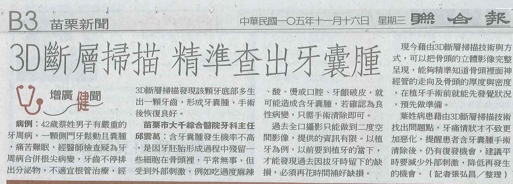 105.11.16聯合:3D斷層掃描精準查出牙囊腫