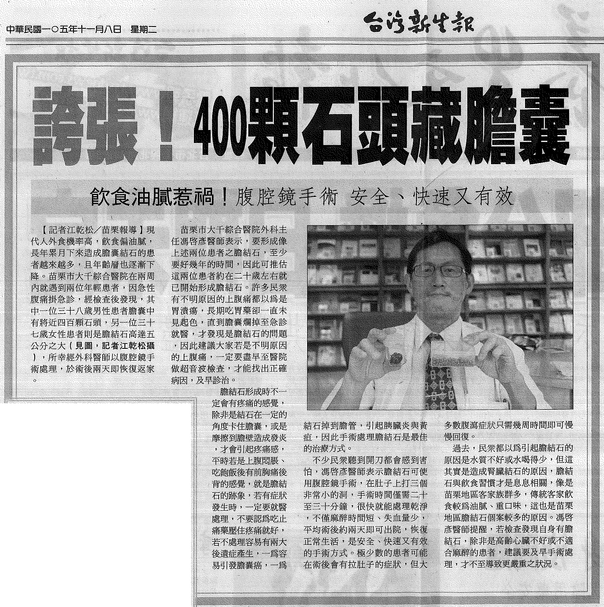 105.11.08台灣新生報:誇張!400顆石頭藏膽囊