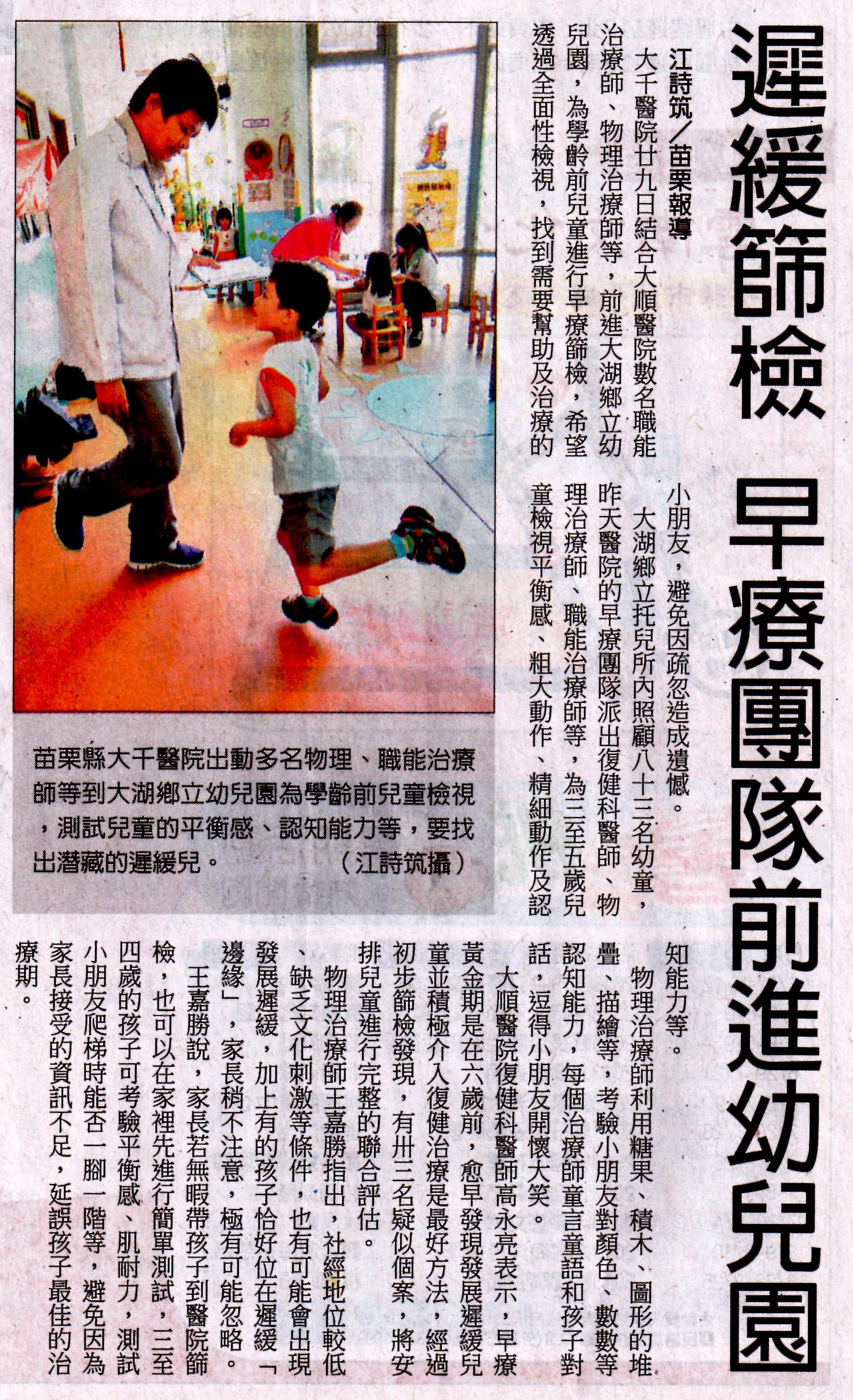 102.05.30中時:遲緩篩檢早療團隊前進幼兒園(大順復健)