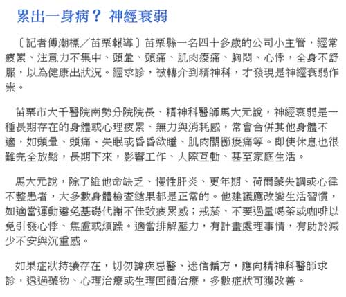自由電子報:累出一身病? 神經衰弱(精神科馬大元)