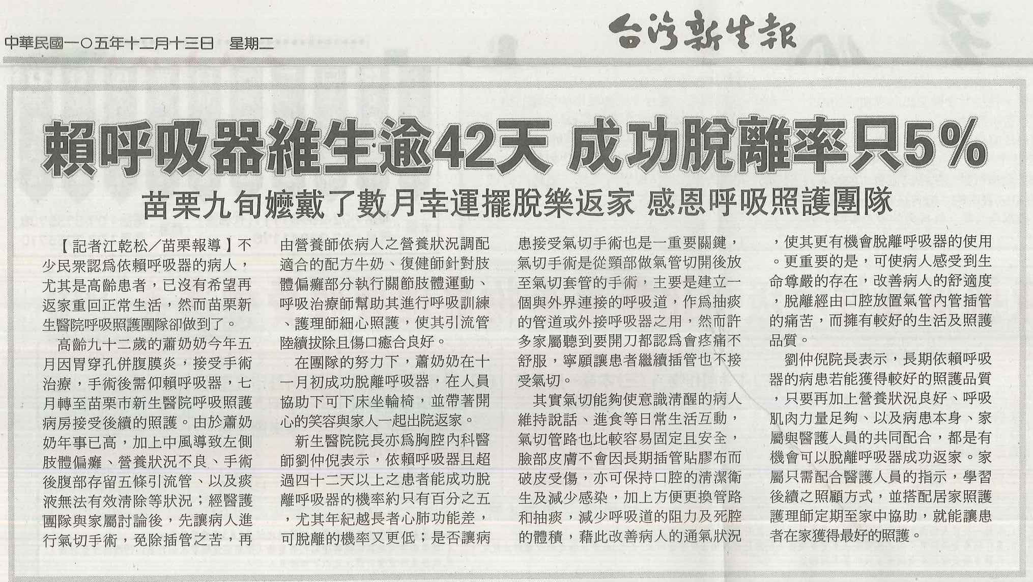 105.12.13台灣新生報:賴呼吸器維生逾42天成功脫離率只5%