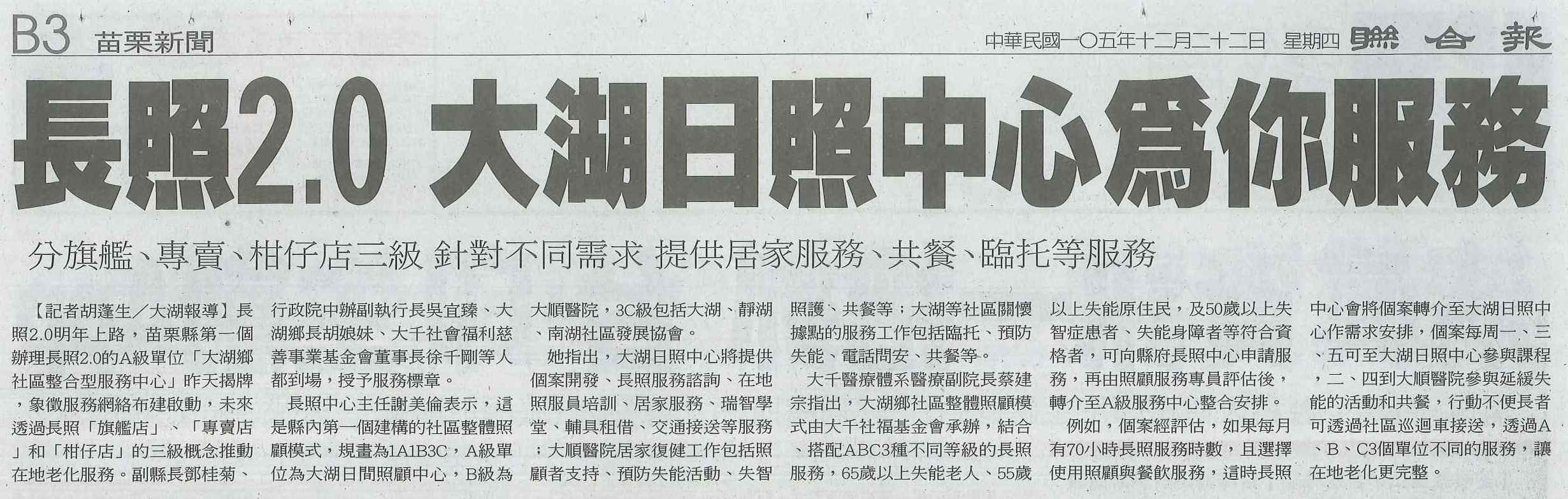 105.12.22聯合:長照2.0大湖日照中心為你服務