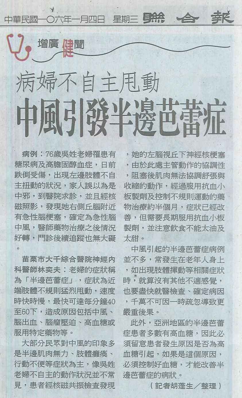 106.01.04聯合:病婦不自主甩動中風引發半邊芭蕾症