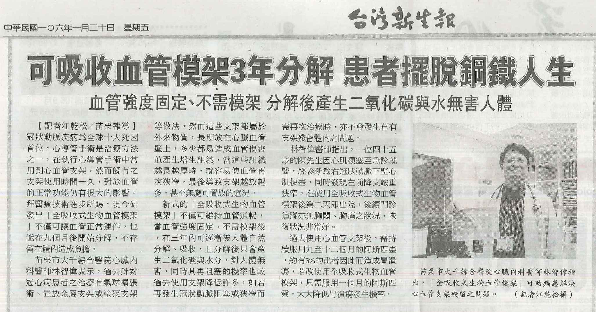 106.01.20台灣新生報:可吸收血管模架3年分解患者擺脫鋼鐵人生