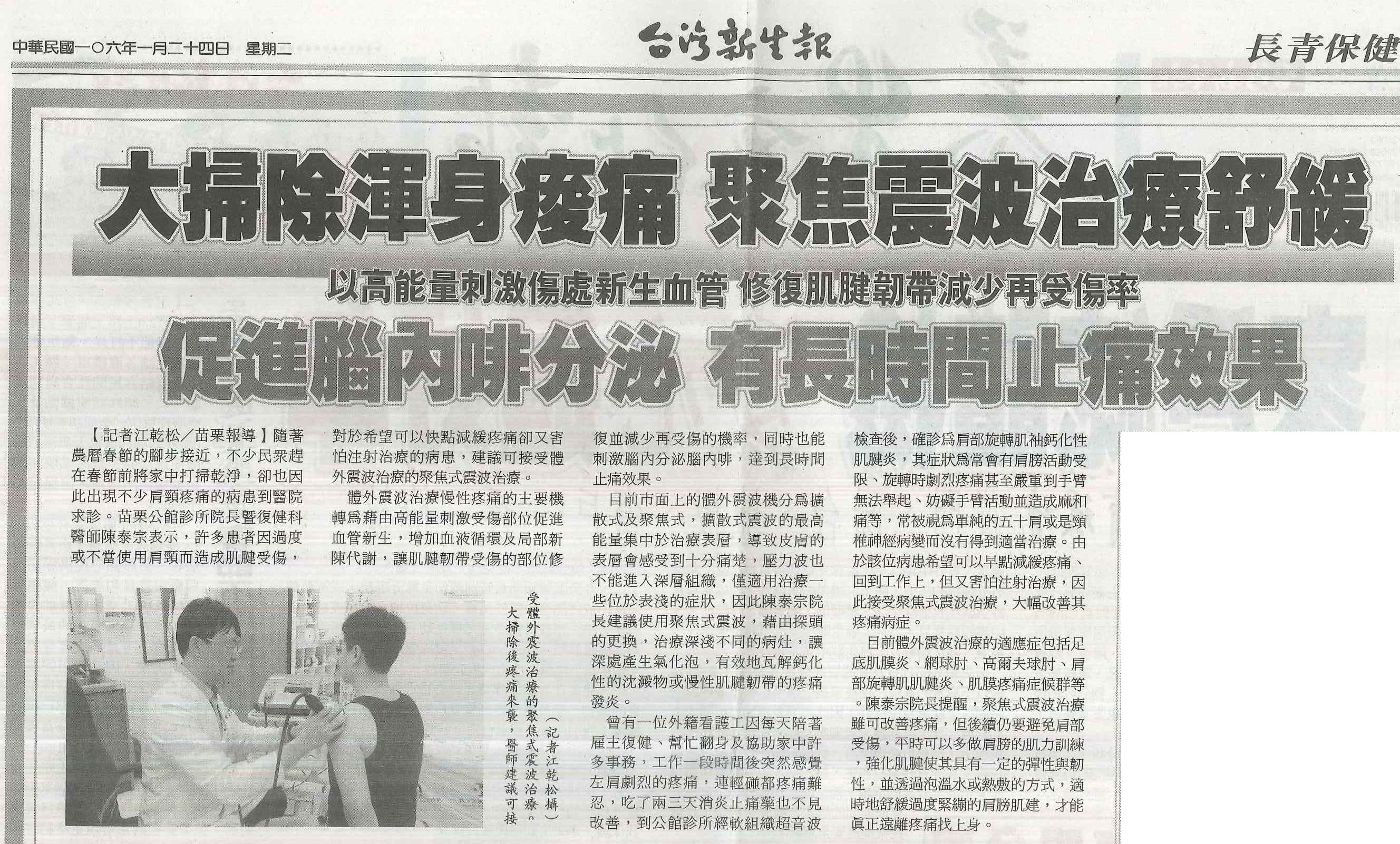 106.01.24台灣新生報:大掃除渾身痠痛聚焦震波治療舒緩
