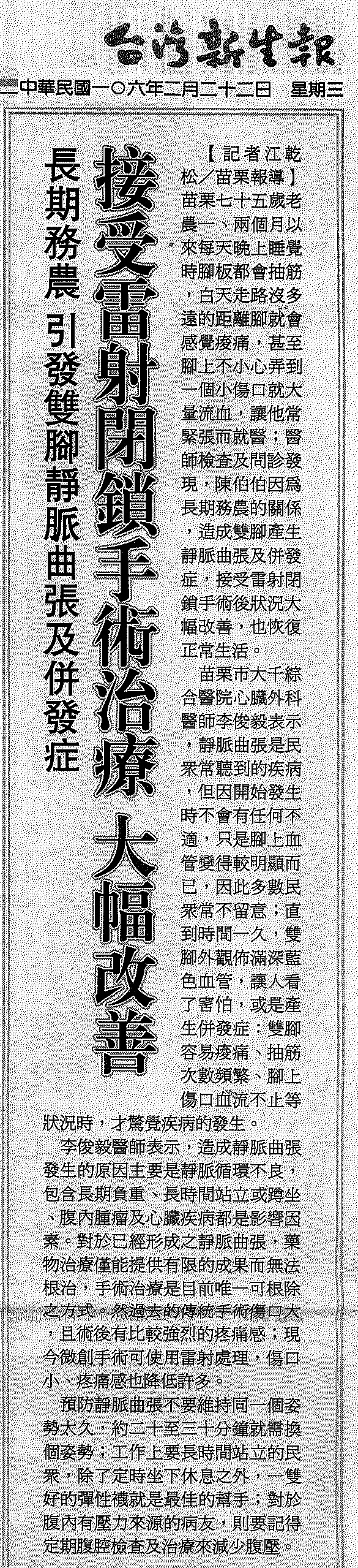 106.02.22台灣新生報:長期務農引發雙腳靜脈曲張及併發症接受雷射閉鎖手術治療大幅改善