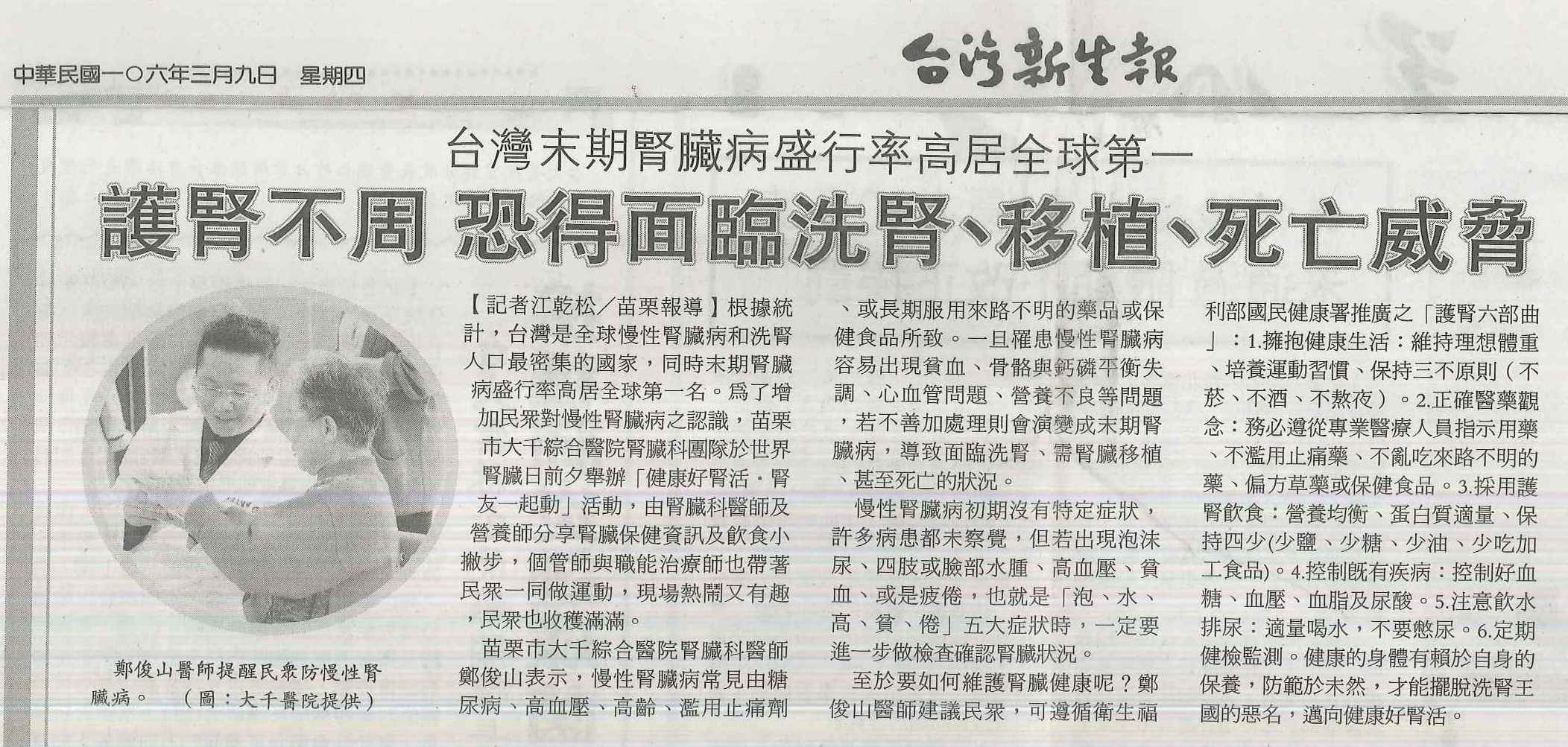 106.03.09台灣新生報:護腎不周恐得面臨洗腎、移植、死亡威脅