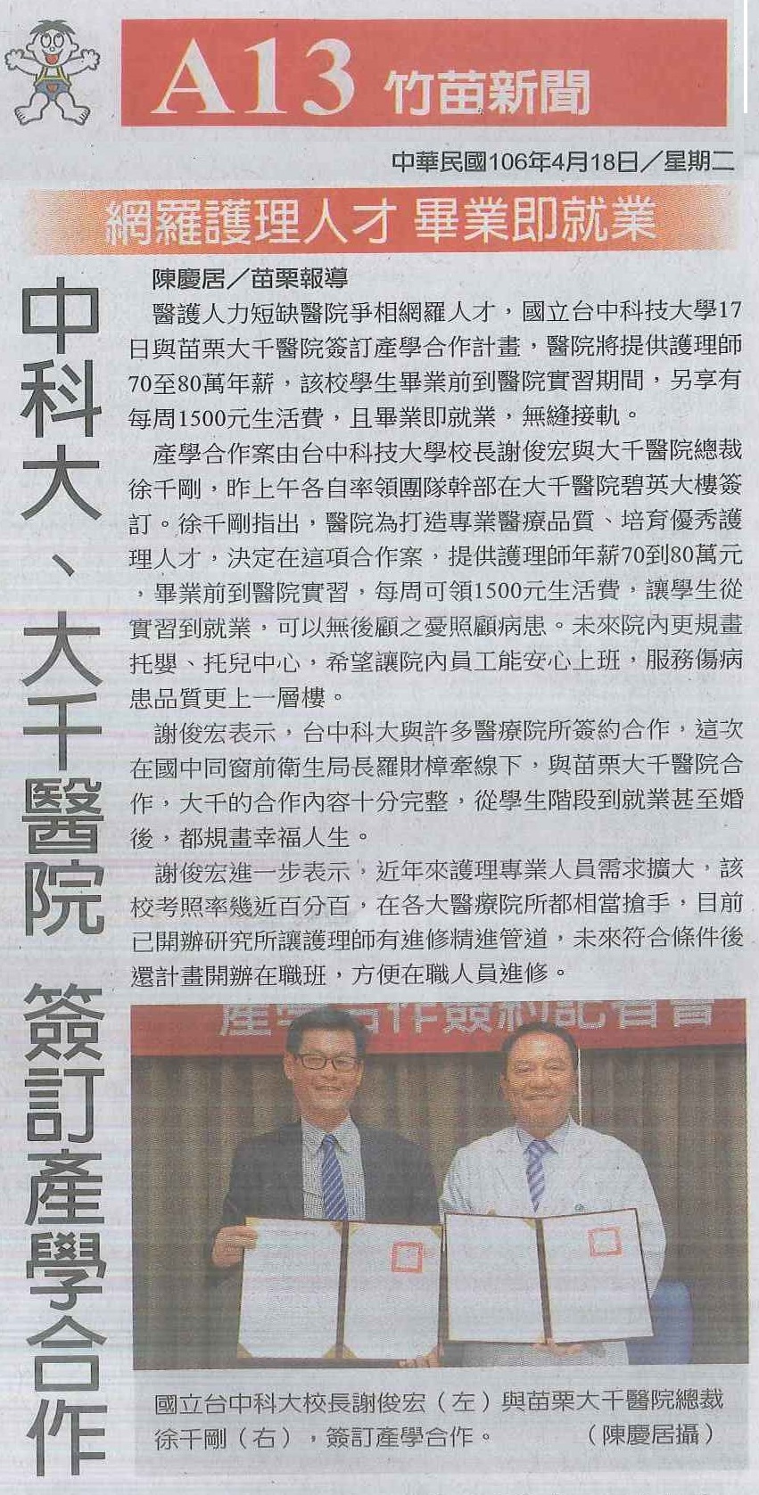 106.04.18中時:中科大、大千醫院簽訂產學合作