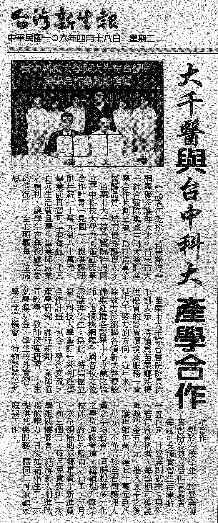 106.04.18台灣新生報:大千醫與台中科大產學合作