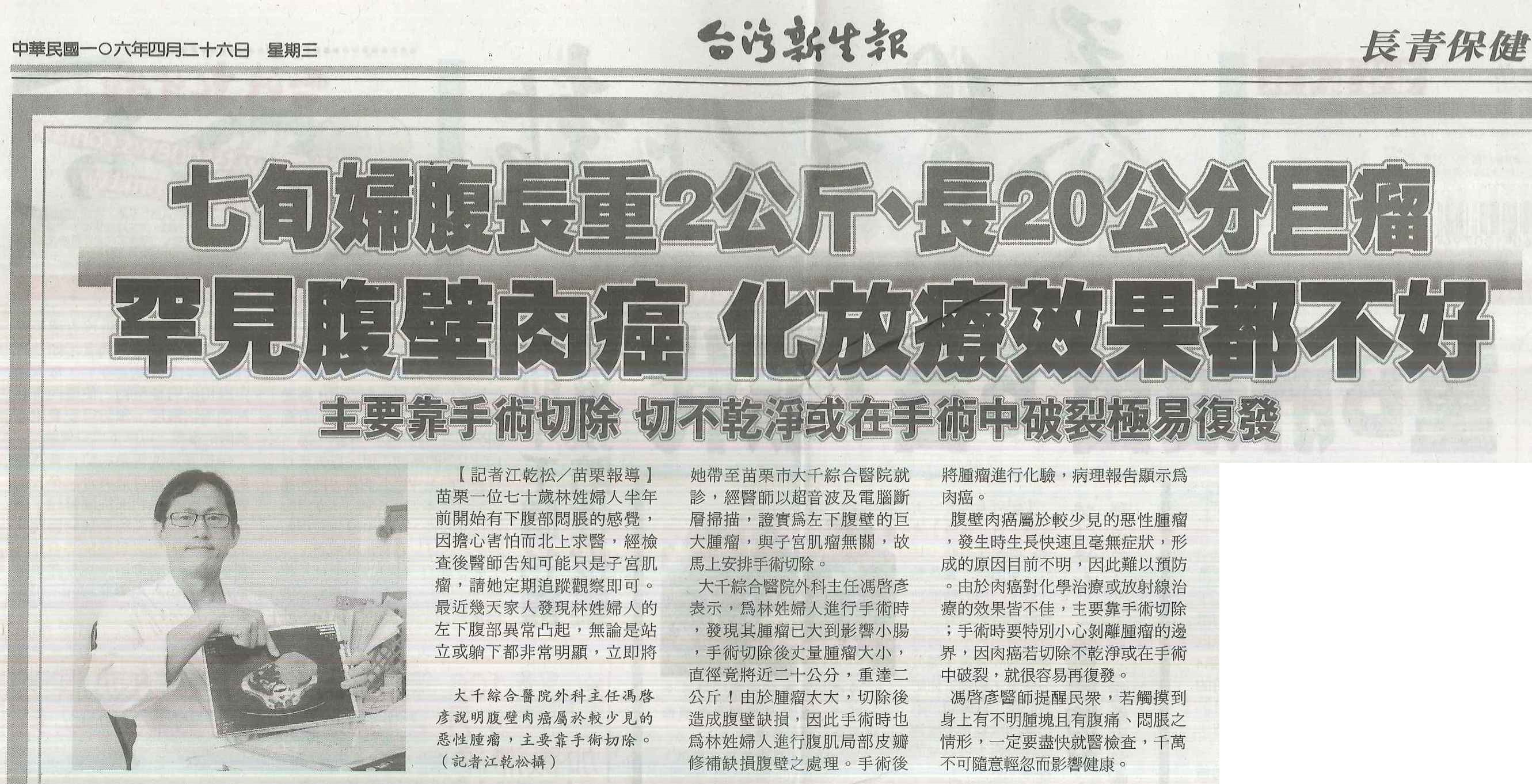 106.04.26台灣新生報:七旬婦腹藏重2公斤、長20公分巨瘤