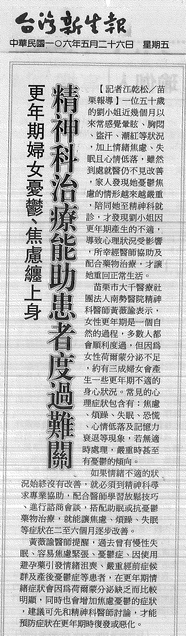 106.05.26台灣新生報:更年期婦女憂鬱、焦慮纏上身精神科治療能助患者度過難關