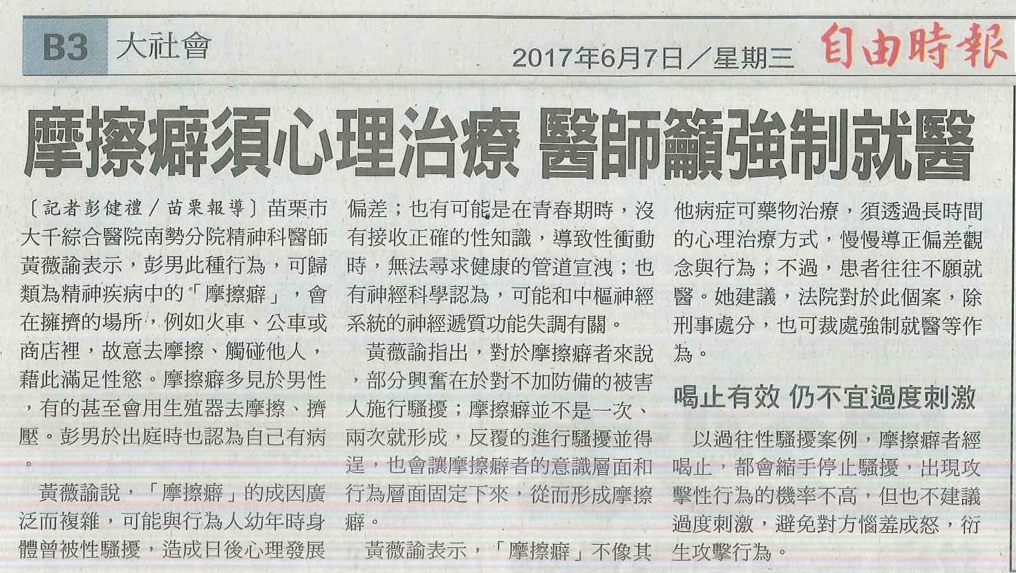 106.06.07自由:摩擦癖需心理治療醫師籲強制就醫