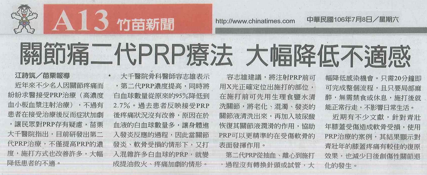 106.07.08中時:關節痛二代PRP療法大幅降低不適感