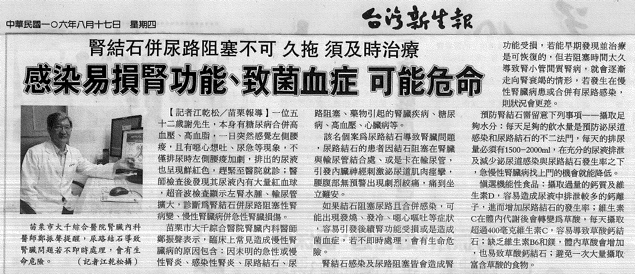 106.08.17台灣新生報:感染易損腎功能、致菌血症可能危命