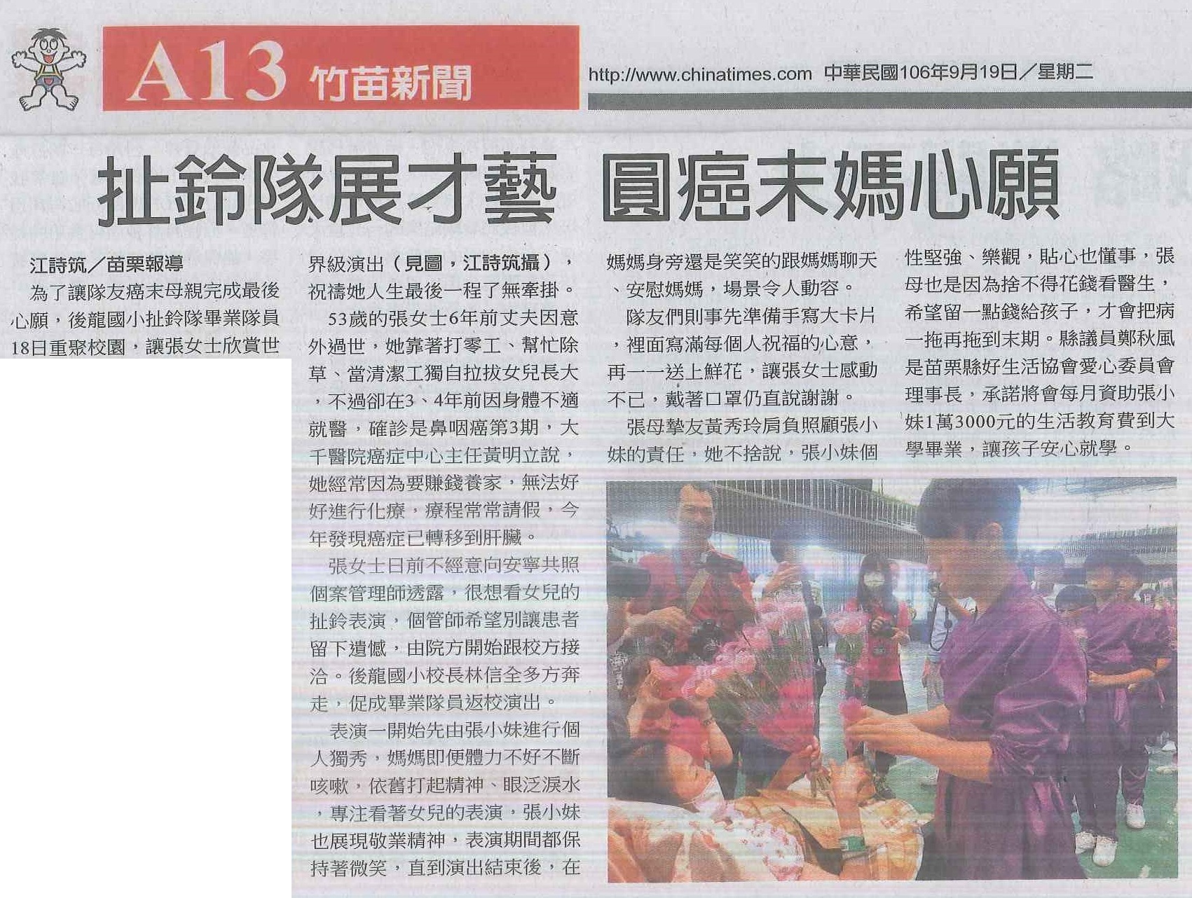 106.09.19中時:扯鈴隊展才藝圓癌末媽心願