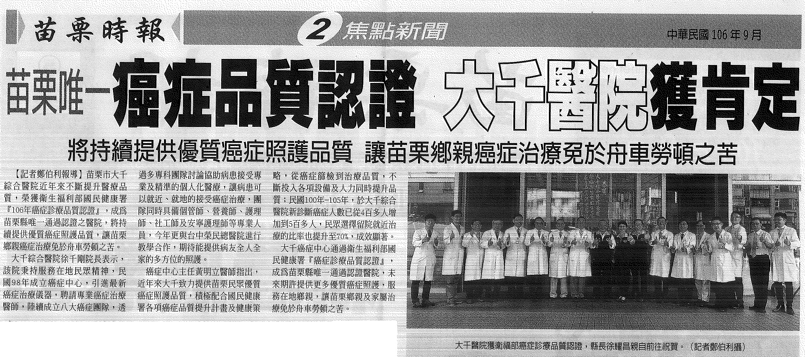 106.09.18苗栗時報:苗栗唯一癌症品質認證大千醫院獲肯定