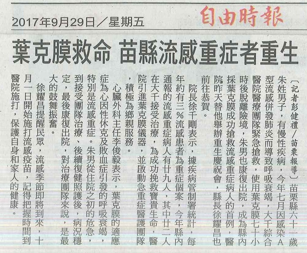 106.09.29自由:葉克膜救命苗縣流感重症者重生