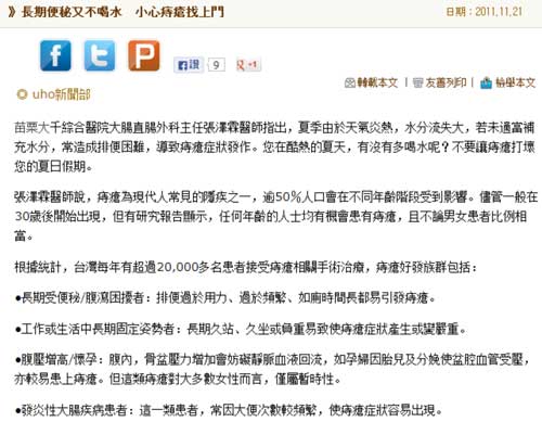 uho優活健康網:長期便秘又不喝水 小心痔瘡找上門(大腸直腸科張澤霖)