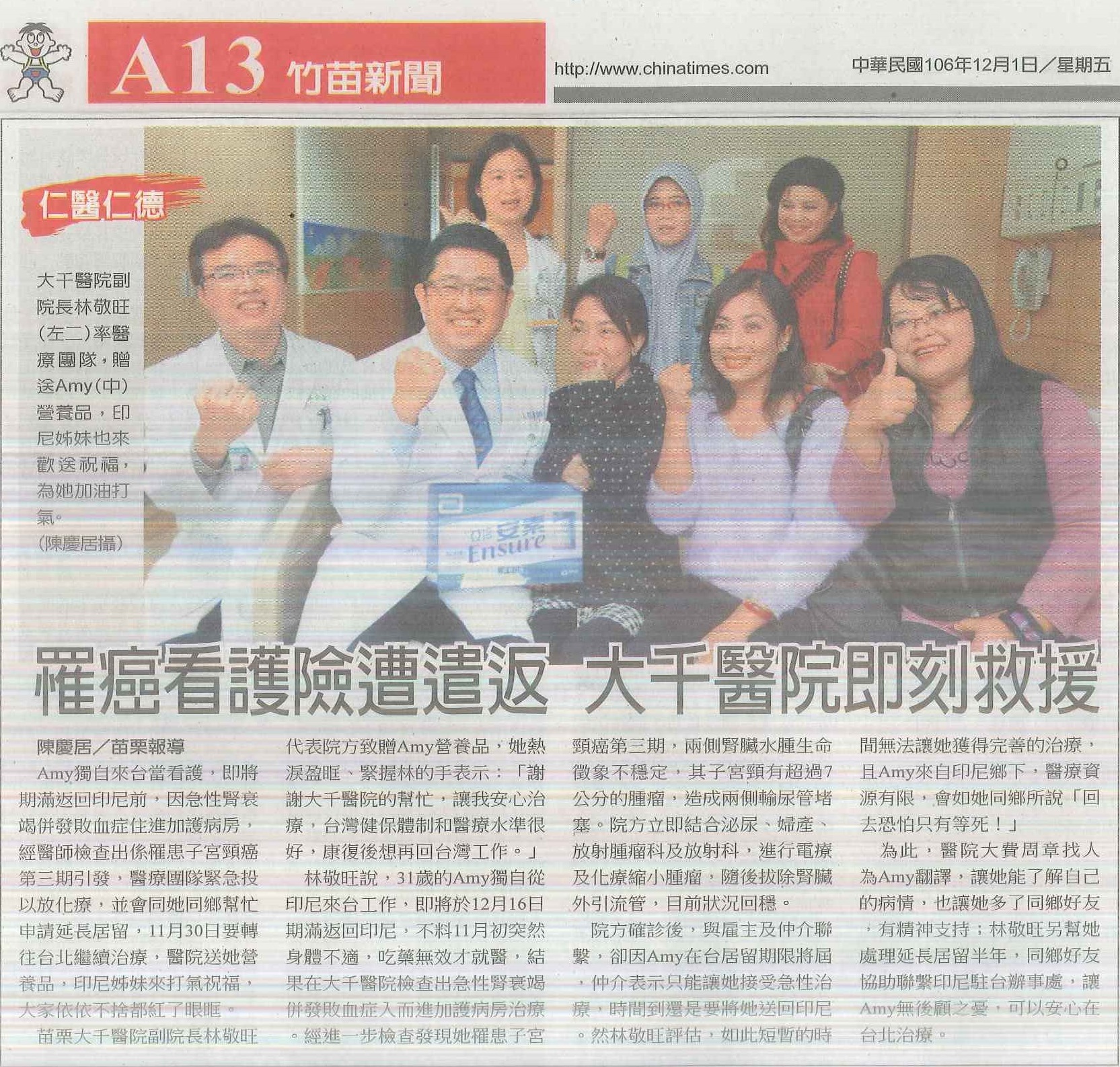 106.12.01中時:罹癌看護險遭遣返大千醫院即刻救援