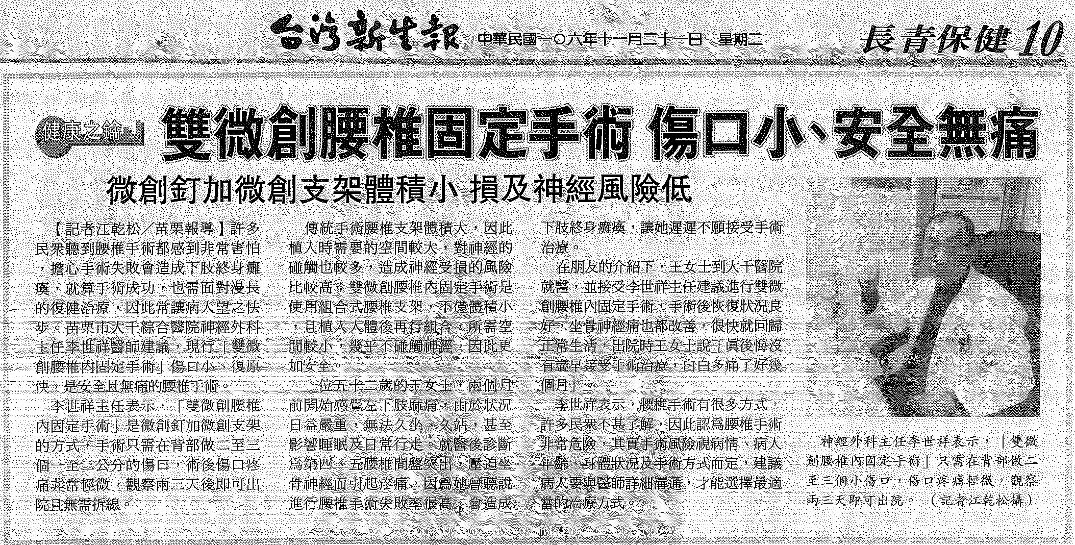 106.11.21台灣新生報:雙微創腰椎固定手術傷口小、安全無痛