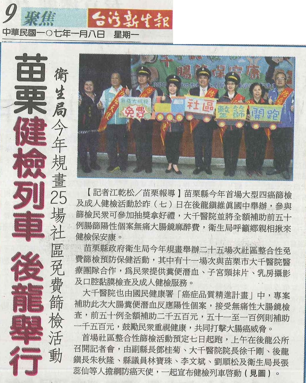 107.01.08台灣新生報:苗栗健檢列車後龍舉行
