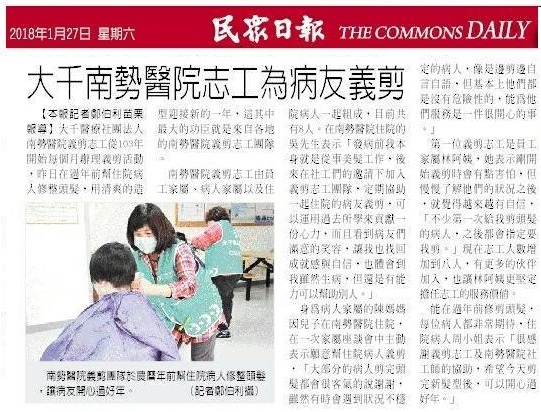 107.01.27民眾日報:大千南勢醫院志工為病友義剪