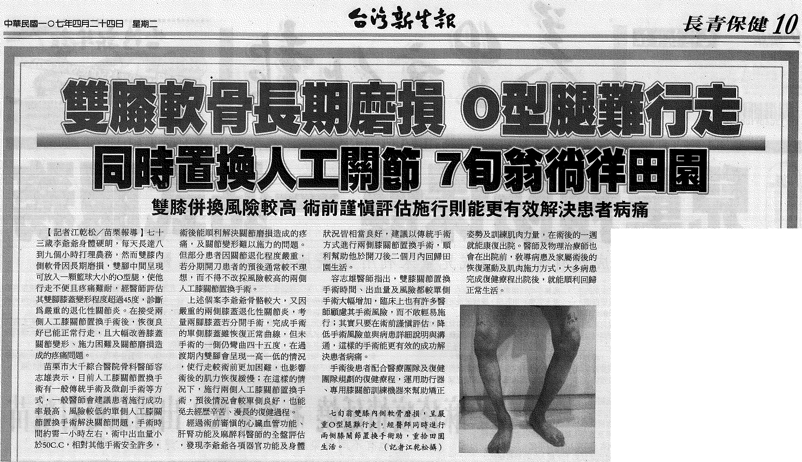 107.04.24台灣新生報:雙膝軟骨長期磨損O型腿難行走