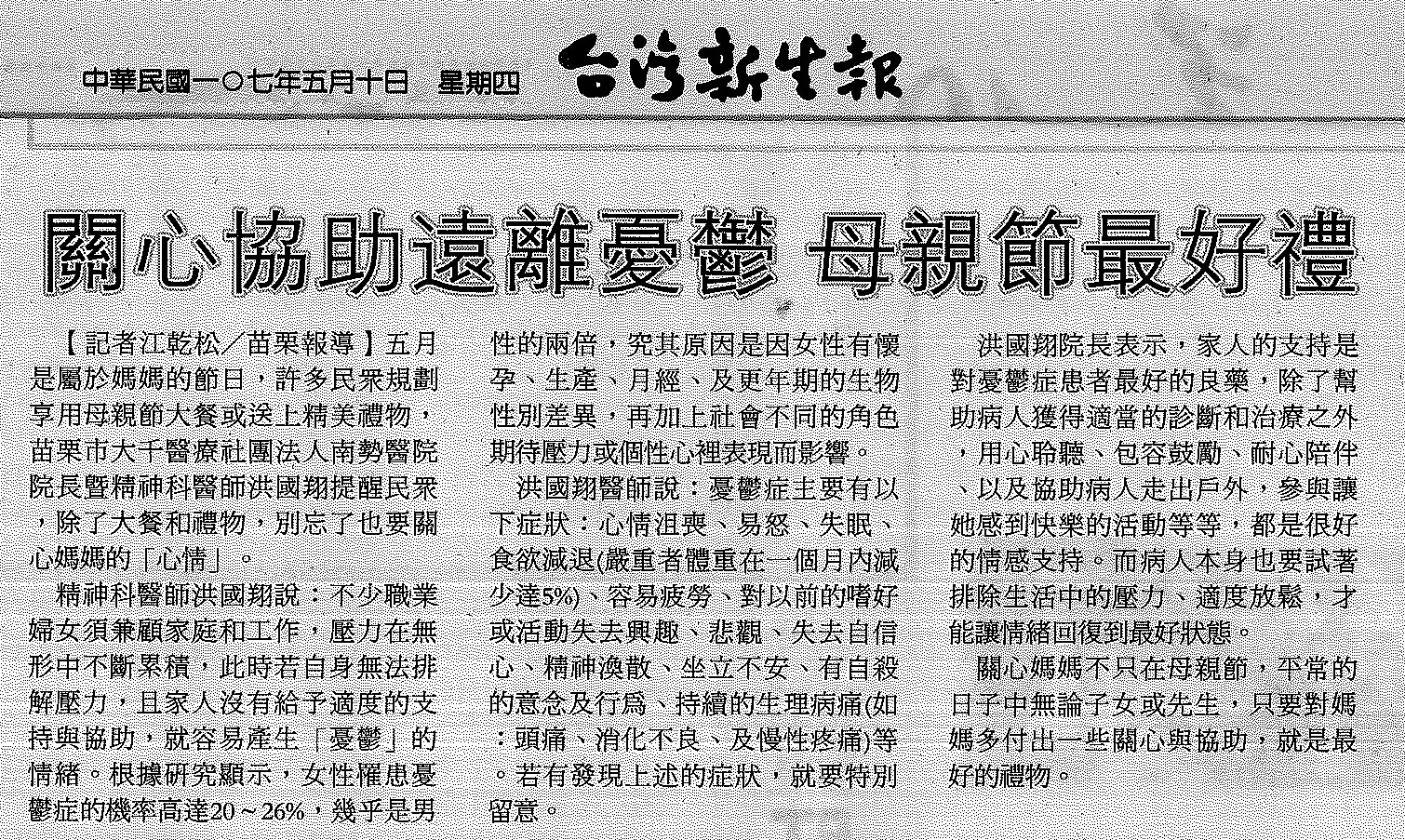 107.05.10台灣新生報:關心協助遠離憂鬱母親節最好禮