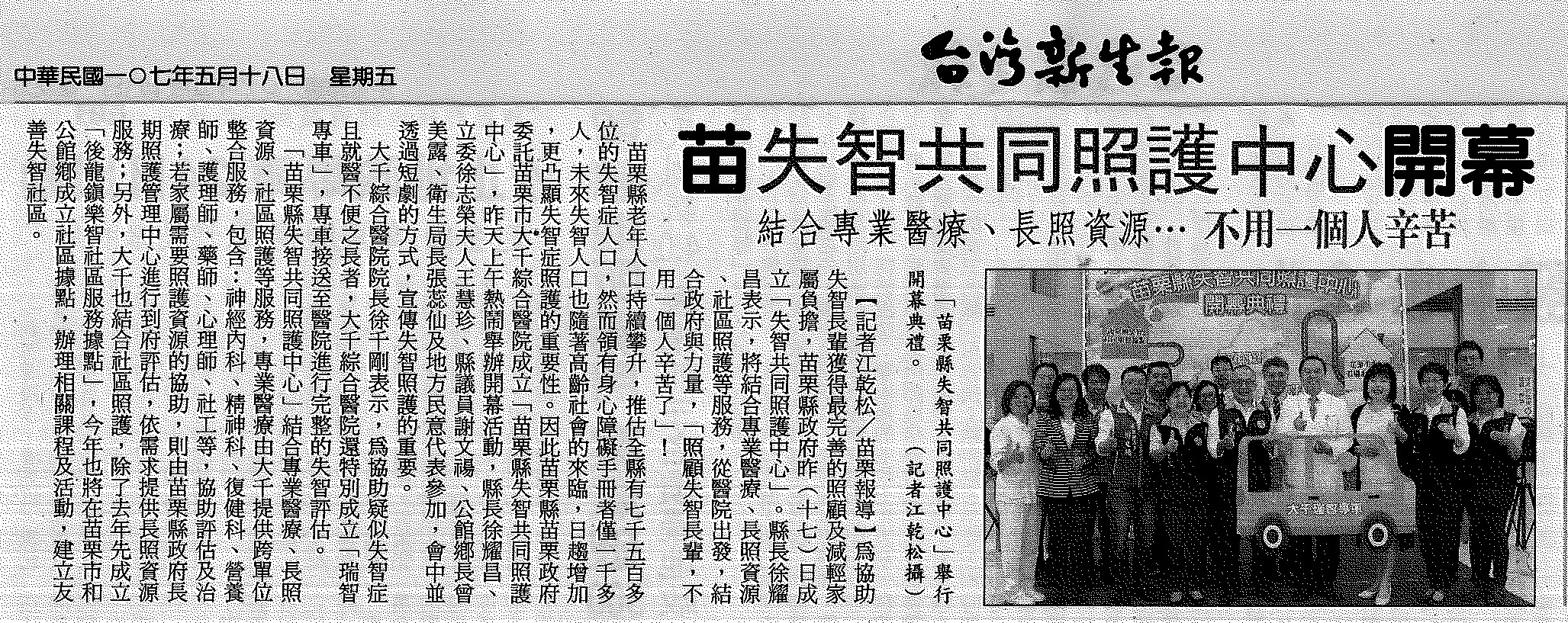 107.05.18台灣新生報:苗失智共同照護中心開幕