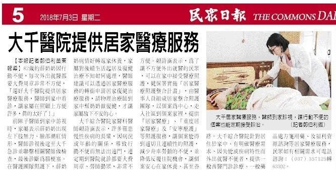 107.07.03民眾日報:大千醫院提供居家醫療服務